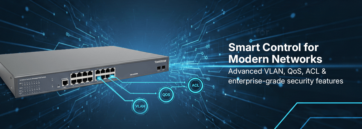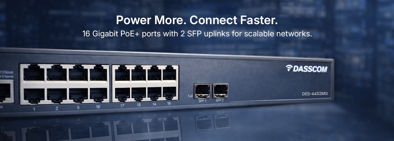 The DES-44S2MG Managed PoE+ Switch is a powerful L2+ network solution designed for enterprise and commercial deployments. It features 16 Gigabit PoE+ ports with IEEE 802.3af/at support and 2 Gigabit SFP uplinks for flexible network expansion. With a 56Gbps switching capacity, advanced VLAN, QoS, security controls, and intelligent PoE management, it ensures reliable power delivery and high-speed data performance. Ideal for IP cameras, VoIP phones, wireless access points, and smart network infrastructures.