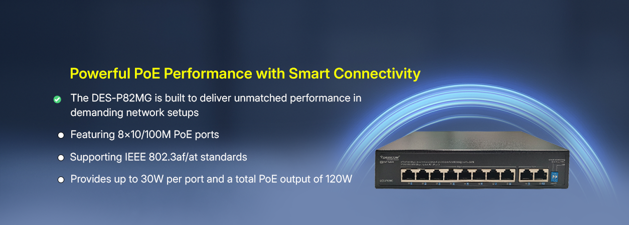 The DES-P82MG is an unmanaged 8-port 10/100M PoE switch with 2 gigabit uplink ports, designed for reliable and efficient power and data transmission. Supporting IEEE 802.3af/at standards, each PoE port delivers up to 30W, with a total PoE power budget of 120W. It automatically detects and powers compatible devices such as wireless APs, IP cameras, VoIP phones, and intercom systems. Ideal for hotels, campuses, factories, and SMBs, the DES-P82MG ensures seamless connectivity and centralized power supply, simplifying deployment and reducing installation costs. Its plug-and-play design makes it perfect for high-density PoE applications in demanding network environments.
