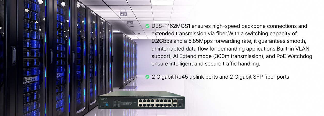 The DES-P162MGS1 poe 16 port gigabit switch is the ultimate solution for businesses looking for a balance of performance, reliability, and cost-efficiency. With intelligent features, a strong power budget, and Dasscom’s trusted quality, this switch is a future-ready choice for modern networks.