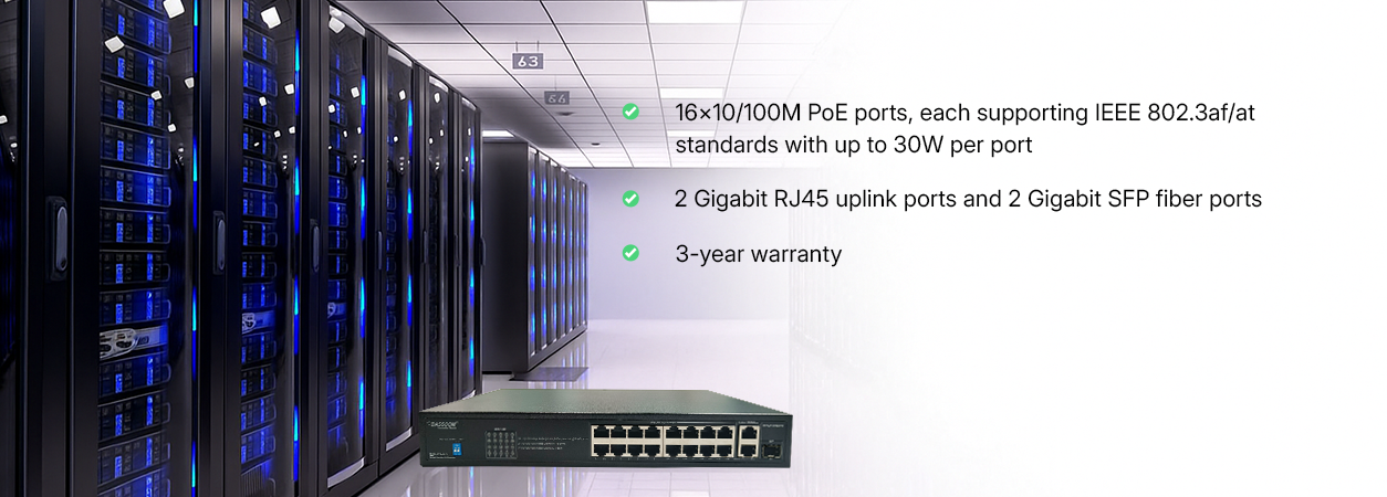 Dasscom delivers advanced features like PoE Watchdog, 300m Extend Mode, and a 3-year warranty—making it the best 16 port PoE switch in its category.