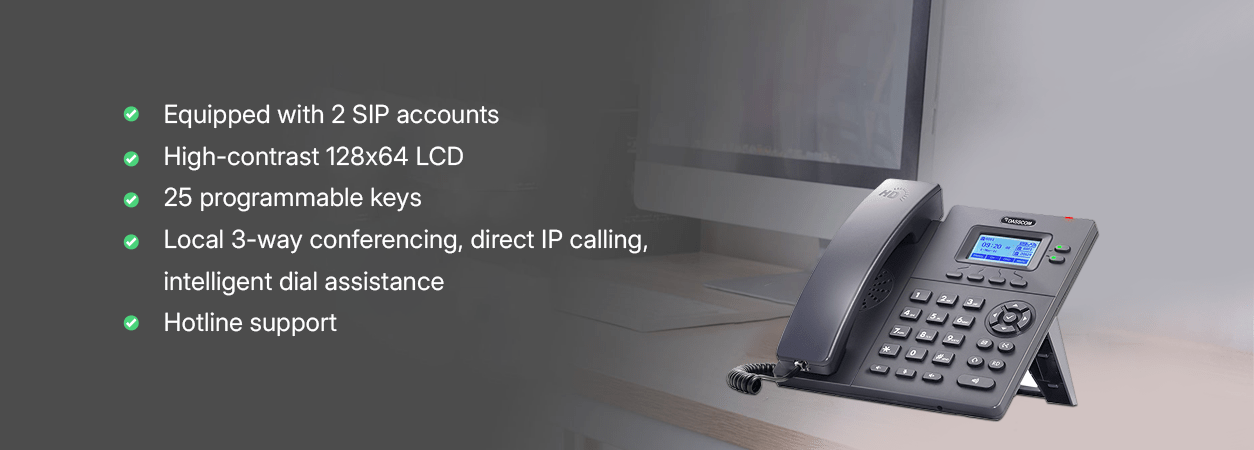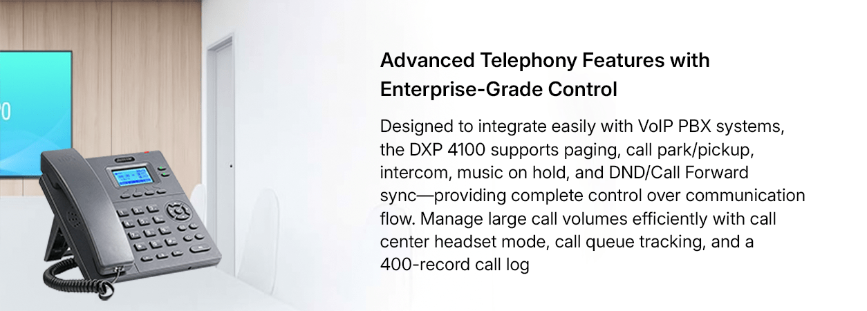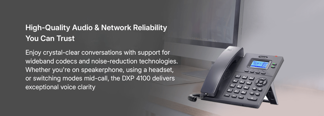The DXP-4100 series is a dual port fast Ethernet IP phone with 2 SIP accounts and 2-line buttons. Its “monochrome screen, HD speaker, simple fixed buttons, unique appearance and exquisite details” bring customers higher work efficiency and user experience. It is a cost-effective economical IP phone specially designed for office. It supports IPV6 and IPV4, with full “user, network, deployment, security” feature and good IPPBX and network compatibility. Its suitable for enterprise unified communications and operator cloud voice. Its innovative multi-scene usage mode greatly enhances the work efficiency of economical IP phones.