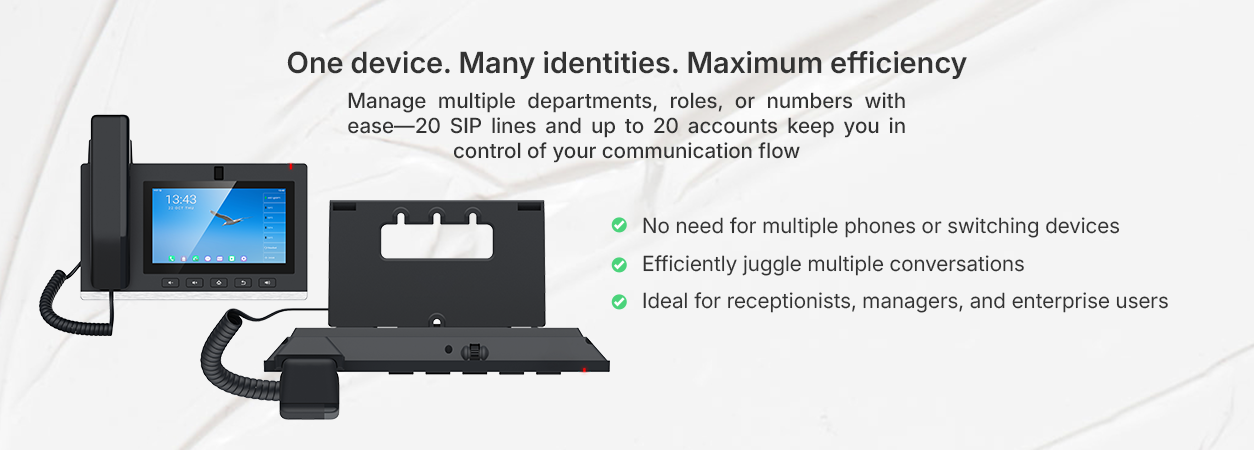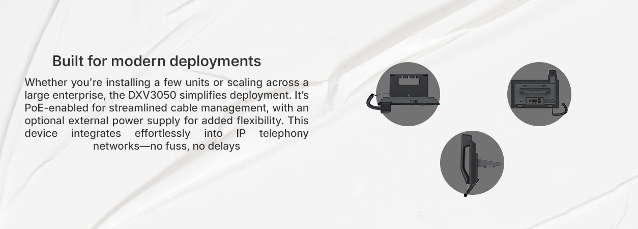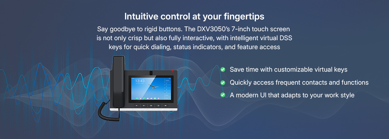 Dasscom DXV-3050 is an advanced video enterprise IP phone powered by Android 9.0 OS, delivering a smart and seamless communication experience. Featuring a 7-inch color touch screen with 112 customizable DSS keys, it offers intuitive navigation and enhanced productivity. The DXV-3050 supports third-party applications, making unified communication more efficient and integrated. Its adjustable built-in camera ensures crystal-clear video conferencing, while HD audio enhances call quality for both personal and group interactions. Designed for modern business environments, the DXV-3050 combines powerful features, flexible app integration, and superior usability in one intelligent desktop communication solution.