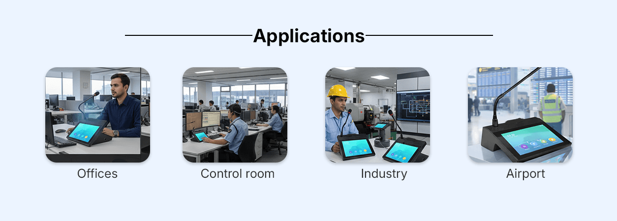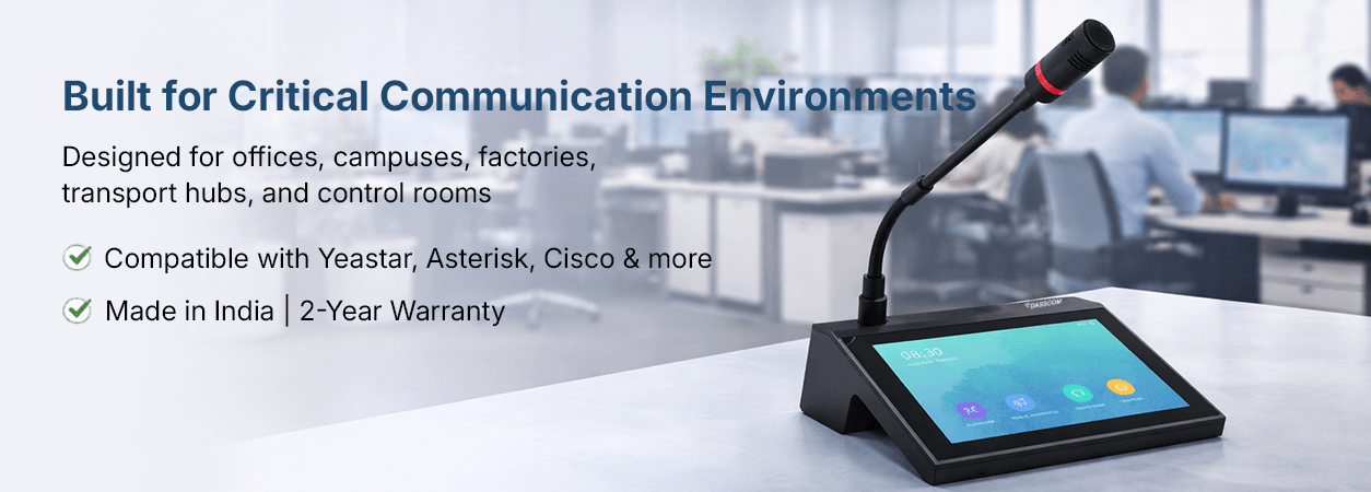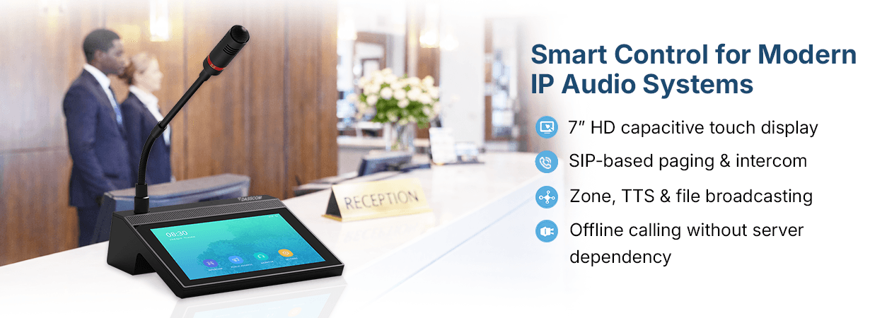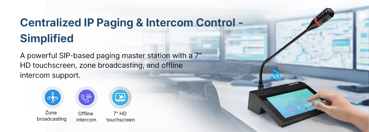 The Dasscom M-30 Network Paging Console Phone is a high-performance IP-based paging and intercom master station built for modern communication environments. Supporting TCP/IP, SIP, and UDP protocols, it enables reliable intercom, zone paging, broadcasting, and control operations. The device features a 7-inch HD capacitive touch screen, a built-in gooseneck microphone, and a digital audio processor for clear full-duplex audio. With support for TTS, pre-recorded broadcasts, offline calling, and seamless integration with mainstream SIP PBX platforms, the M-30 is ideal for centralized IP audio and paging systems.